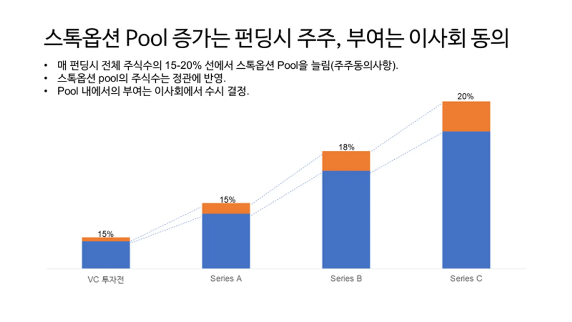 미국 스타트업은 스톡옵션이 전체 주식수의 15-20% 수준이 되도록 펀딩때마다 스톡옵션 풀을 증가시킵니다. 채용시마다 옵션을 적극적으로 활용하므로 시간이 지나면 스톡옵션 풀이 모자라기 때문입니다.